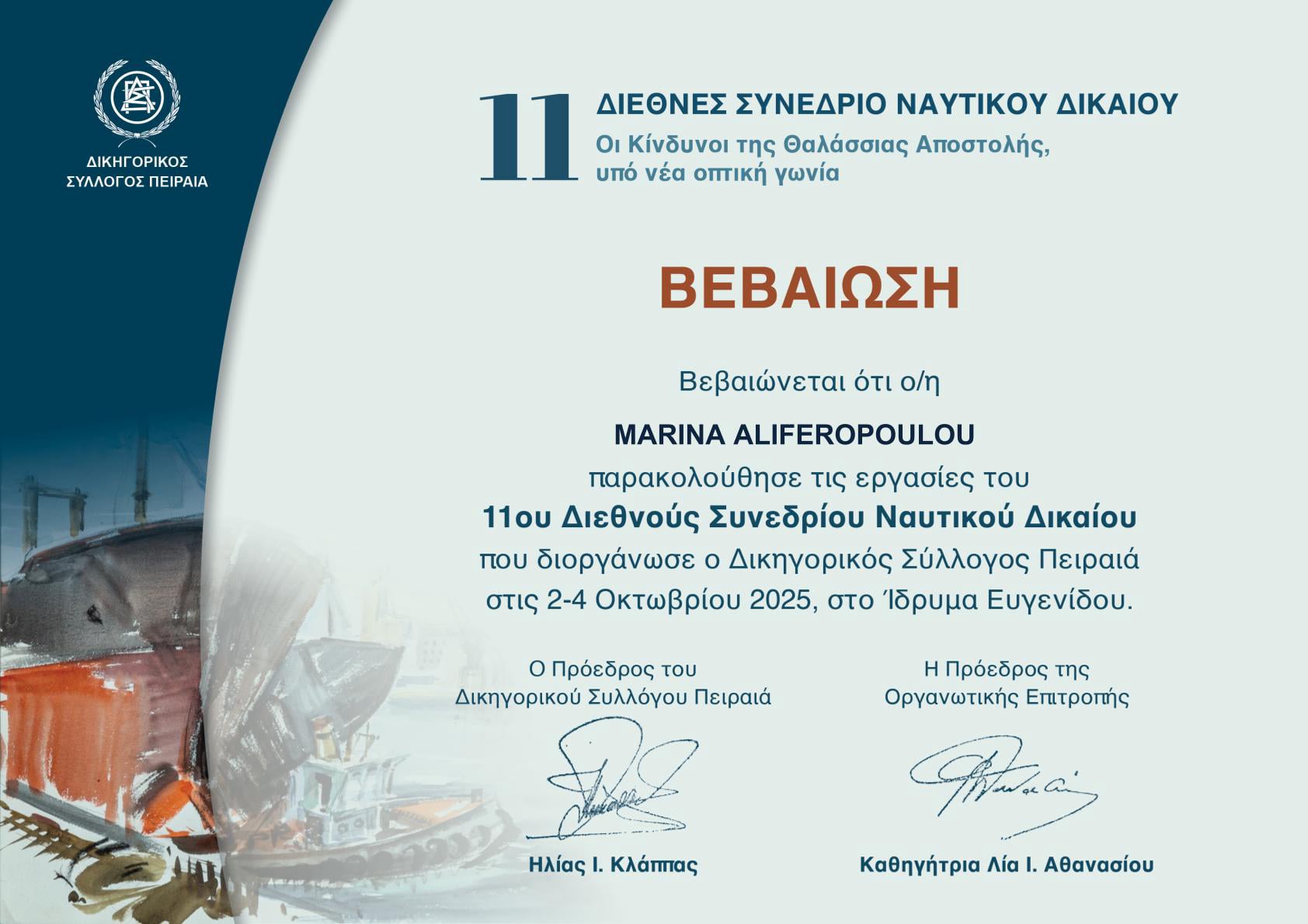 -2016-2017 παρακολούθηση του μεταπτυχιακού Ναυτικού Δικαίου στη Νομική Σχολή Αθηνών.