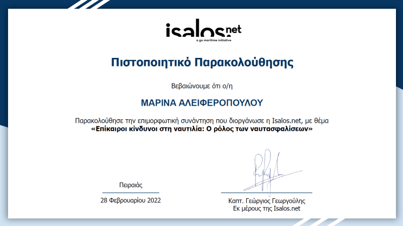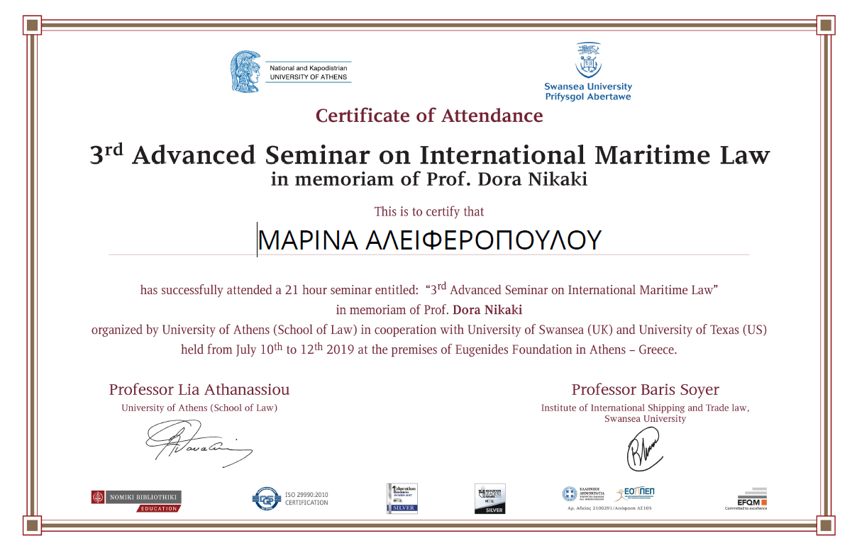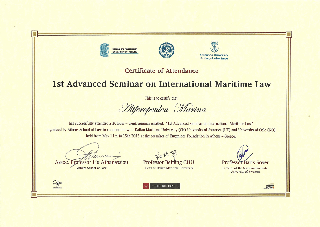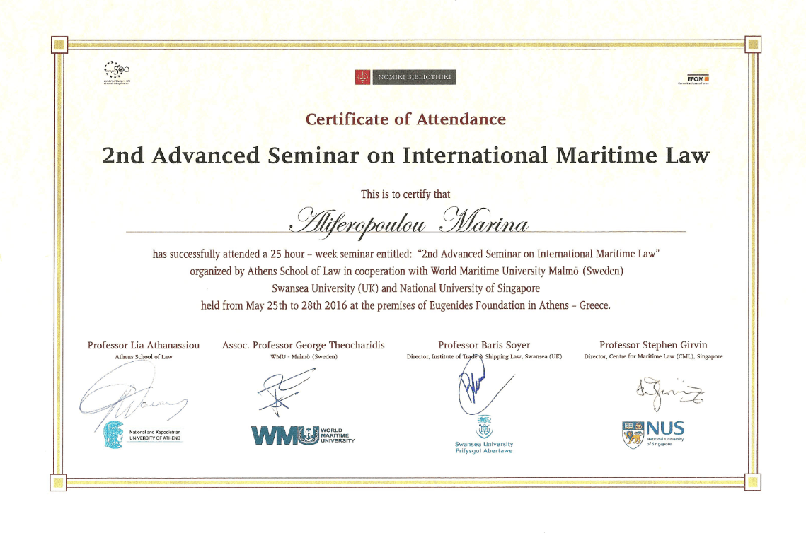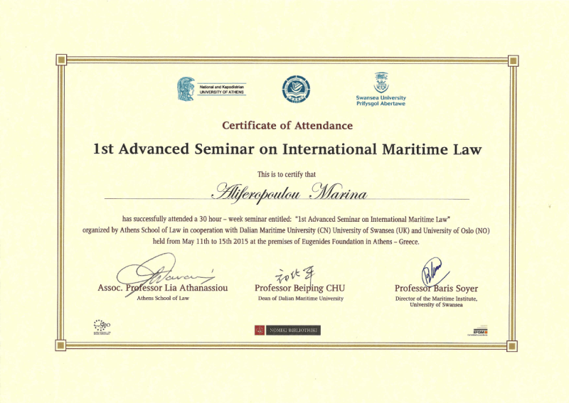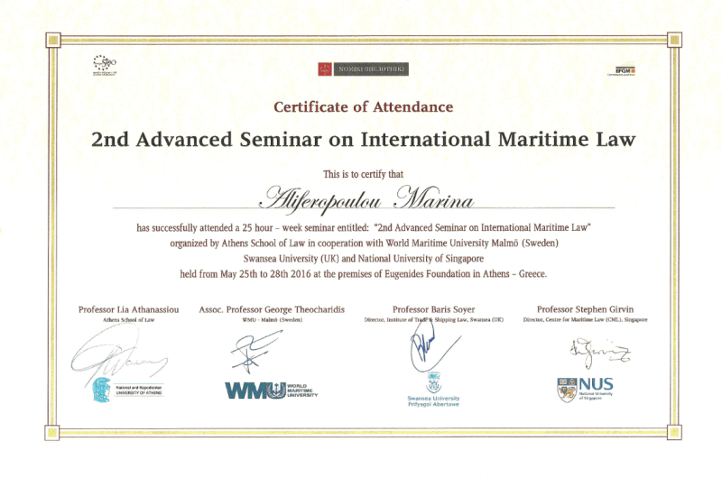 - 2016-2017, Attended postgraduate studies in Maritime Law at the Faculty of Law, University of Athens.