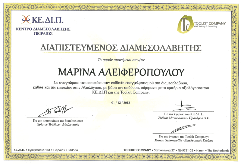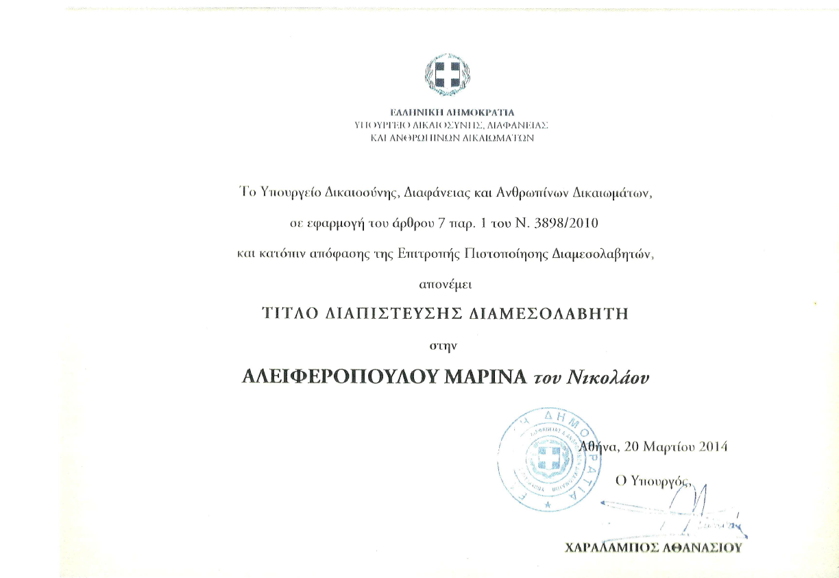 - 2013-2014, Training and accreditation as a Mediator at KEDIP Piraeus.